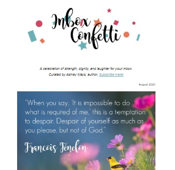 Sign Up for Inbox Confetti See Past Issues of Inbox Confetti Buy The Great Date Experiment! Watch 60 Second Stories of Strength Submit Your Receipt for Paperback Goodies Listen to Me on The Hope Prose Podcast Buy Create! Buy Be Strong & Take Heart Listen to Me on GWU’s WebbChat